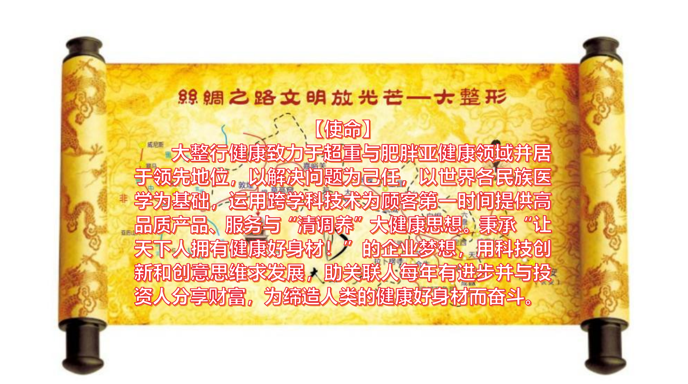 大整行健康致力于超重与肥胖亚健康领域并居于领先地位,以解决问题为己任,以世界各民族医学为基础,运用跨学科技术为顾客第一时间提供高品质产品、服务与“清调养”大健康思想。秉承“让天下人拥有健康好身材!”的企业梦想,用科技创新和创意思维求发展,助关联人每年有进步并与投资人分享财富,为缔造人类的健康好身材而奋斗。