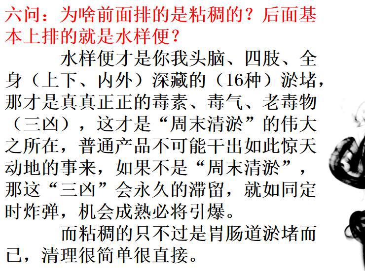 四、大约1小时左右开始第一次排粗硬、粘稠、恶臭的宿便。大约1小时