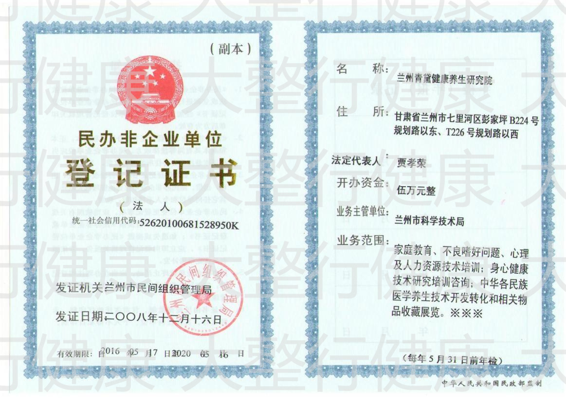 兰州青黛健康养生研究院 证书