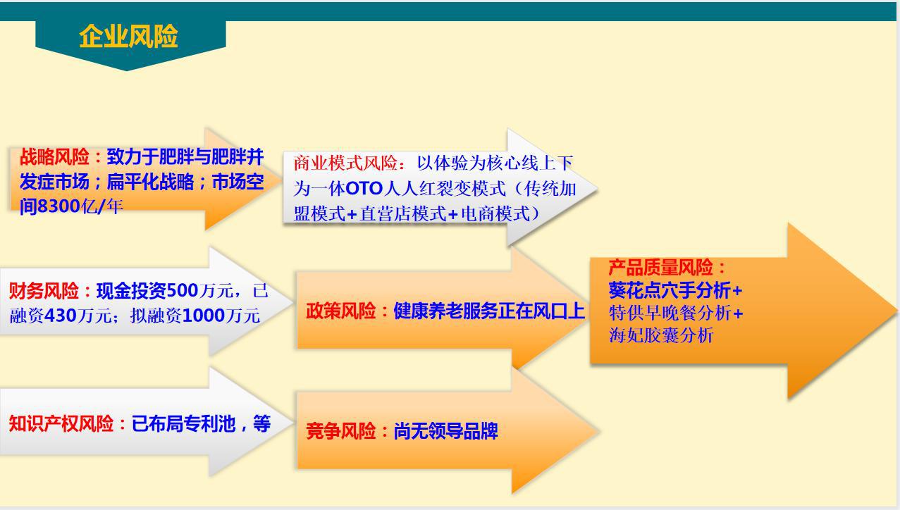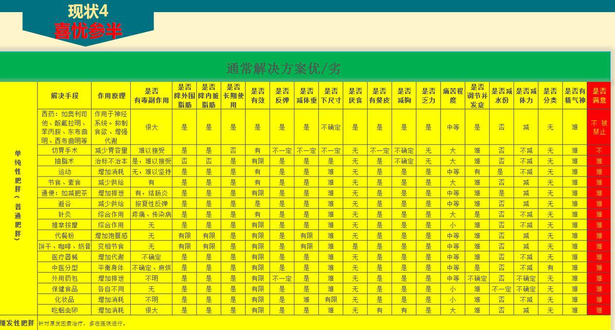 2.2016年6-9月,经过SWOT等工具分析,“大整行健康”将采用“绿色点穴+特供早晚餐+海妃胶囊+没旧湿就是肚小美”脂肪管理减肥方案,针对不同人群的超重和肥胖问题,给出“一类人群一方案”的解决思路,致力于率先解决3.41亿中国超重与肥胖人群的75个痛点,决心解除超重、肥胖及其并发症人群的全天候、24小时、不间断的重大困扰和痛苦。