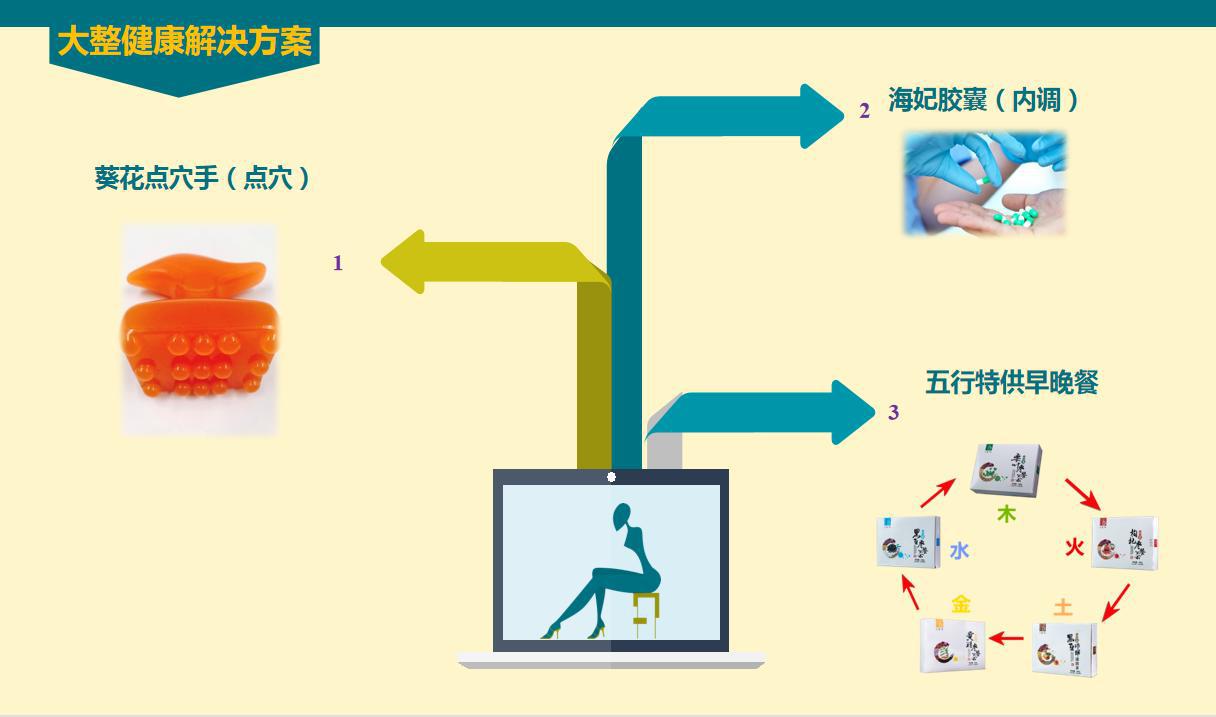 5.2016年6月-2017年6月,经过多次设计、试验、开模、小试、中试,最后确定了具有独家自主知识产权的用于点穴位的“葵花点穴手”;经过数月创意并行成“大整行健康”分属于“五行”的窈窕代餐方案。