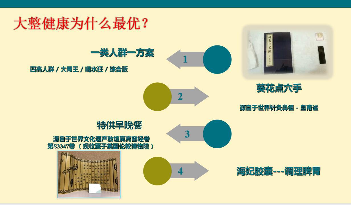 7.基于此前丝绸之路上的世界文化遗产-敦煌莫高窟壁画经卷、世界针灸鼻祖皇甫谧“针灸甲乙经”经卷所提炼出的“大整行健康”脂肪管理思路、方案和精华配方。