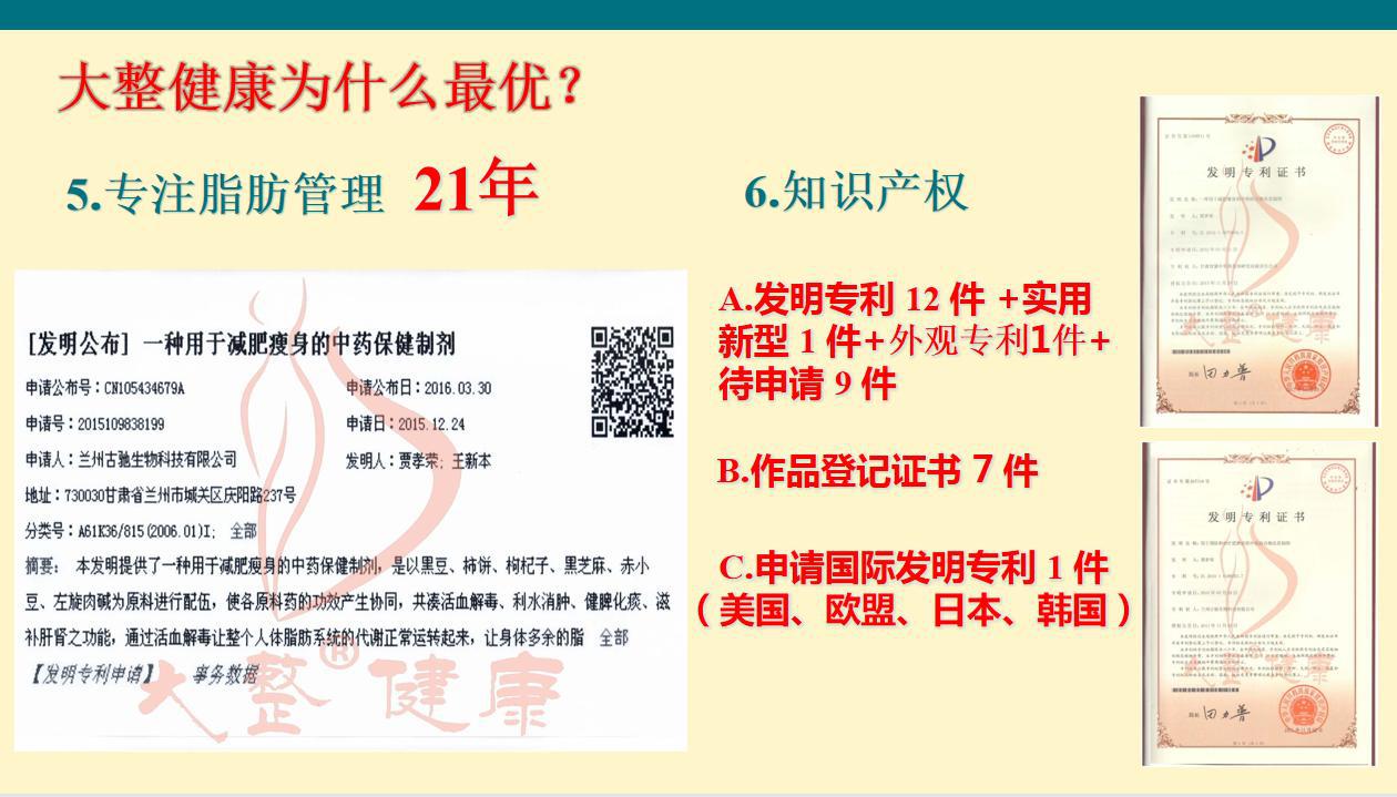 8.2016年年底,通过近三年的努力,由甘肃中医药大学、兰州大学、兰州古驰生物科技有限公司、甘肃青黛中草药美容研究有限责任公司共同申报的“甘肃省中医药减肥技术研究与应用工程中心”被第三方专家团与甘肃省发展和改革委员会审核批准!并由兰州青黛健康养生研究院和“大整健康”品牌所在的“甘肃大整健康管理股份有限公司”领衔负责全面解决人类超重和肥胖问题。