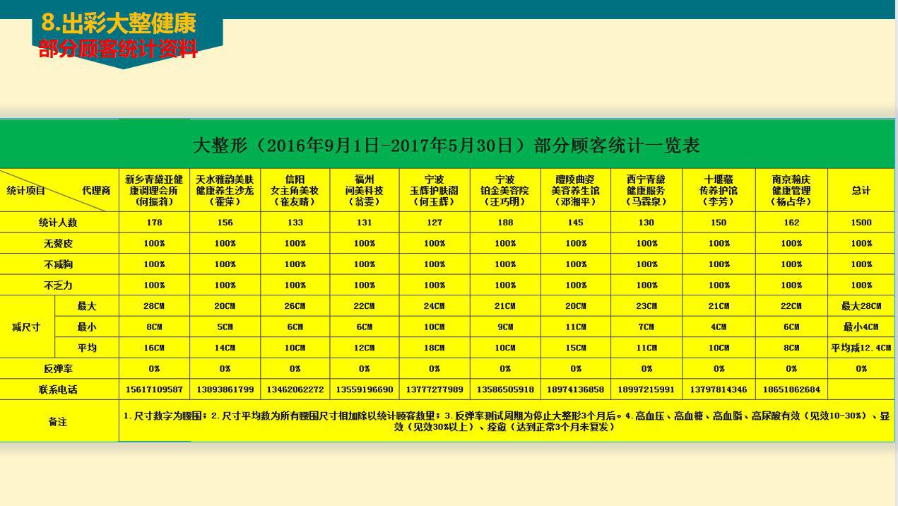 1.2016年1-6月,通过全球大量市场调研、全国专家多轮多此次论证,确立“大整行健康”的大方向就是一家致力于人类亚健康的轻资产公司,细分市场方向为塑形减肥市场,公司梦想为“让天下人拥有健康好身材!”公司愿景是“成为全球领先的脂肪管理运营商!”