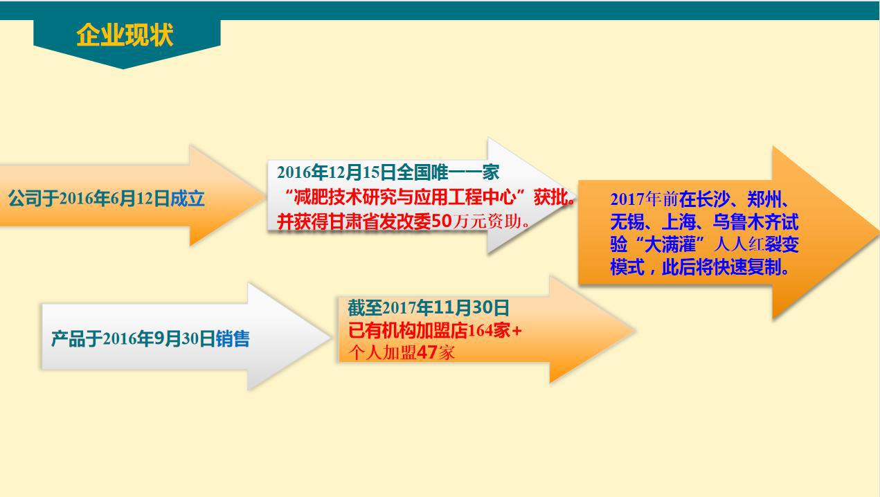 公司成立于2016年6月12日,位于丝绸之路重镇兰州,使用研发22年的百余项已有发明专利技术——“点穴减肥+海妃胶囊+特供早晚餐+没旧湿就是肚小美”方案,使用独家“OTO人人红裂变”商业模式,致力于解决具有75个痛点的3.41亿中国超重与肥胖人群的轻资产大健康类企业。